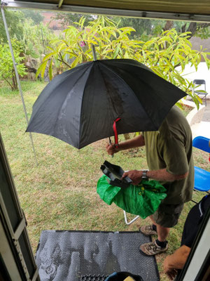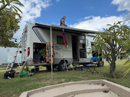 Am Morgen bei Sonnenschein, ist der Strom da, die Stützen lassen sich hochfahren und wir können zu Sabine und Stefan fahren, wo wir die ersten Tage verbringen.